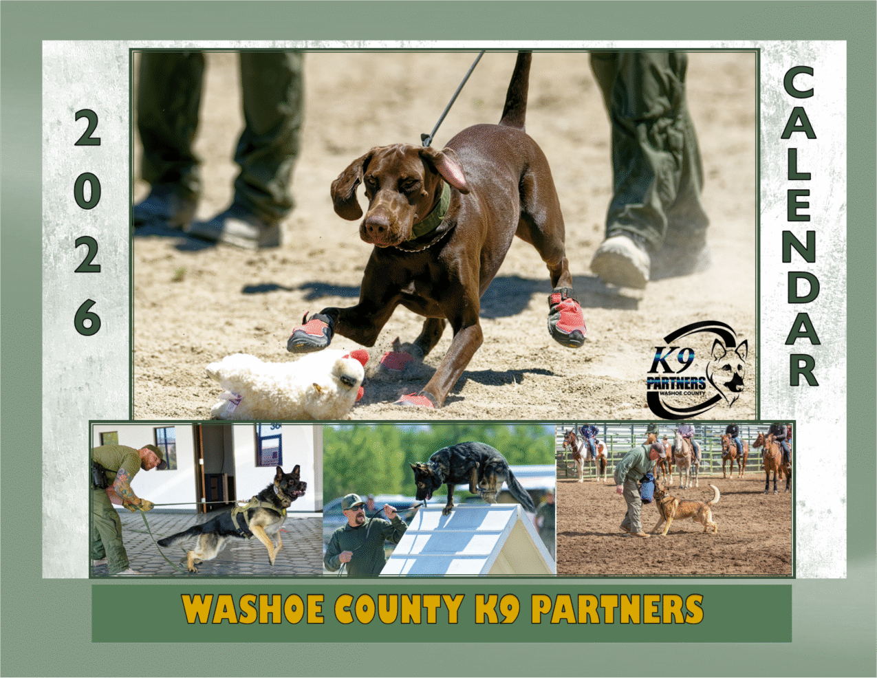 Now Available: 2026 Washoe County K9 Calendar! Celebrate our K9 heroes with a 28-page full-color calendar featuring the Washoe County K9s and their deputy partners. Your $20 donation (plus $5 shipping) supports the K9 Unit directly. Order online or pick one up at Scheels.