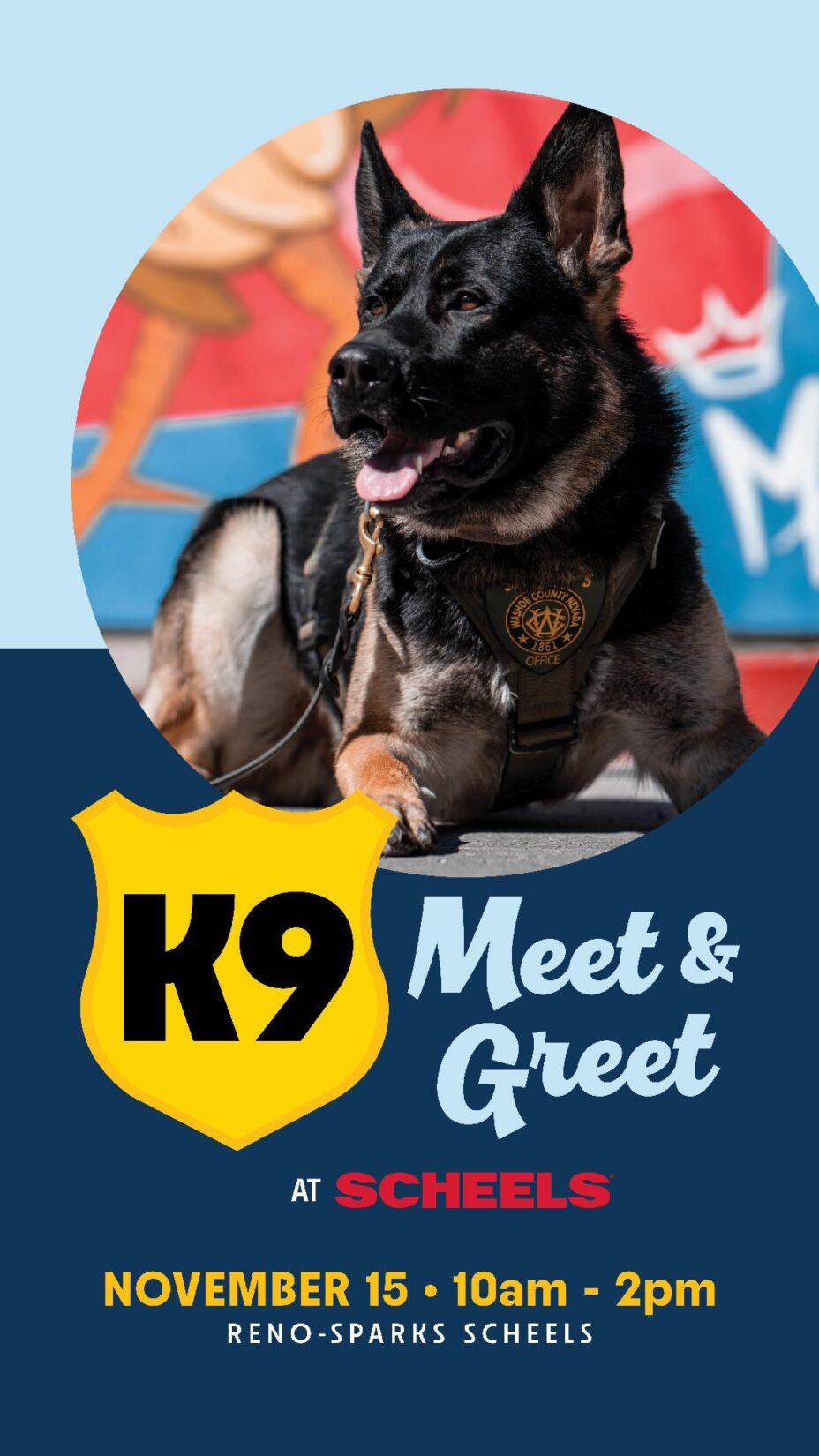 Come meet some of our Washoe County K9s and some of the volunteers of K9 Partners at this Meet and Greet at Scheels today, Saturday November 15!